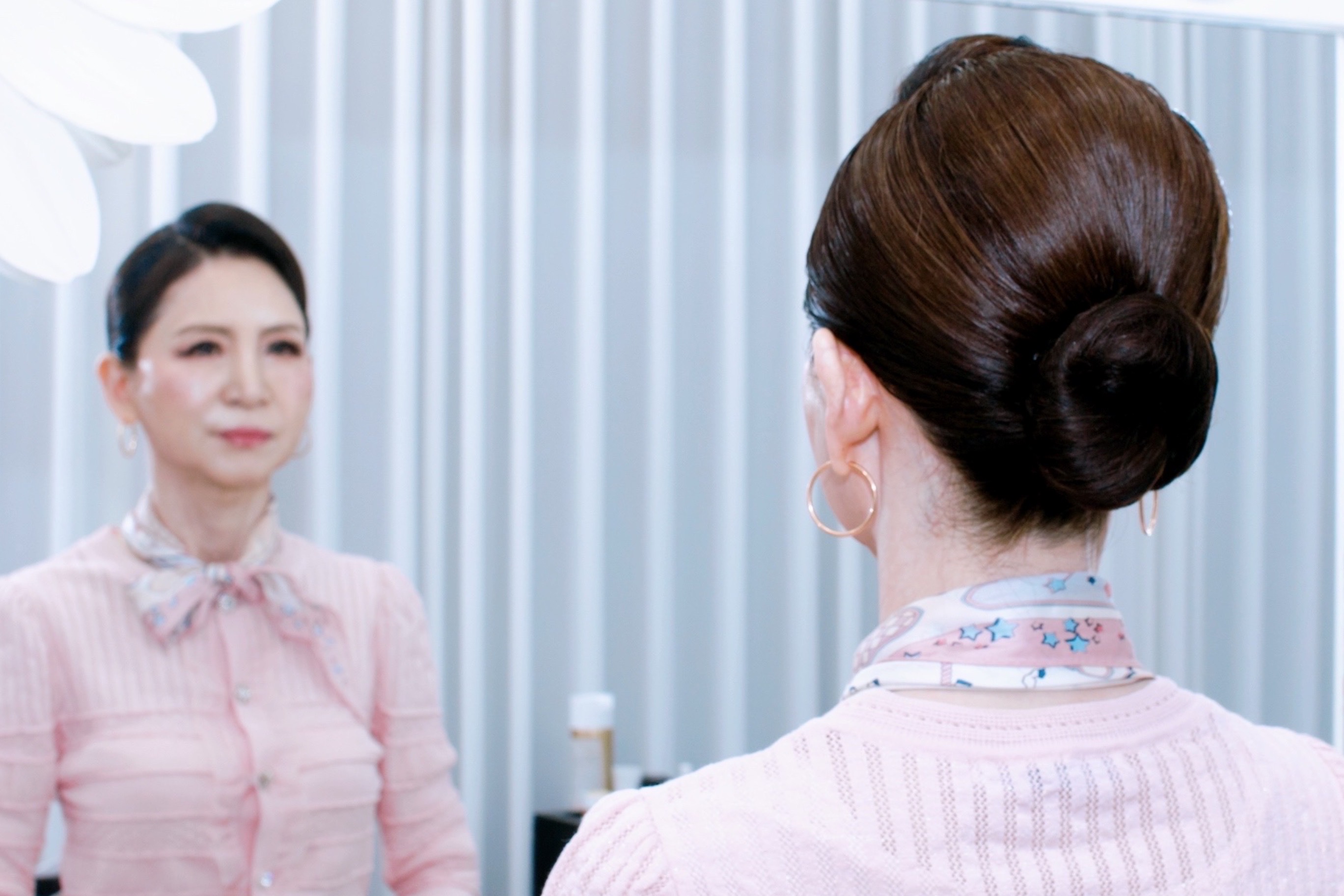 여성 헤어는 단단하게 고정된 업스타일