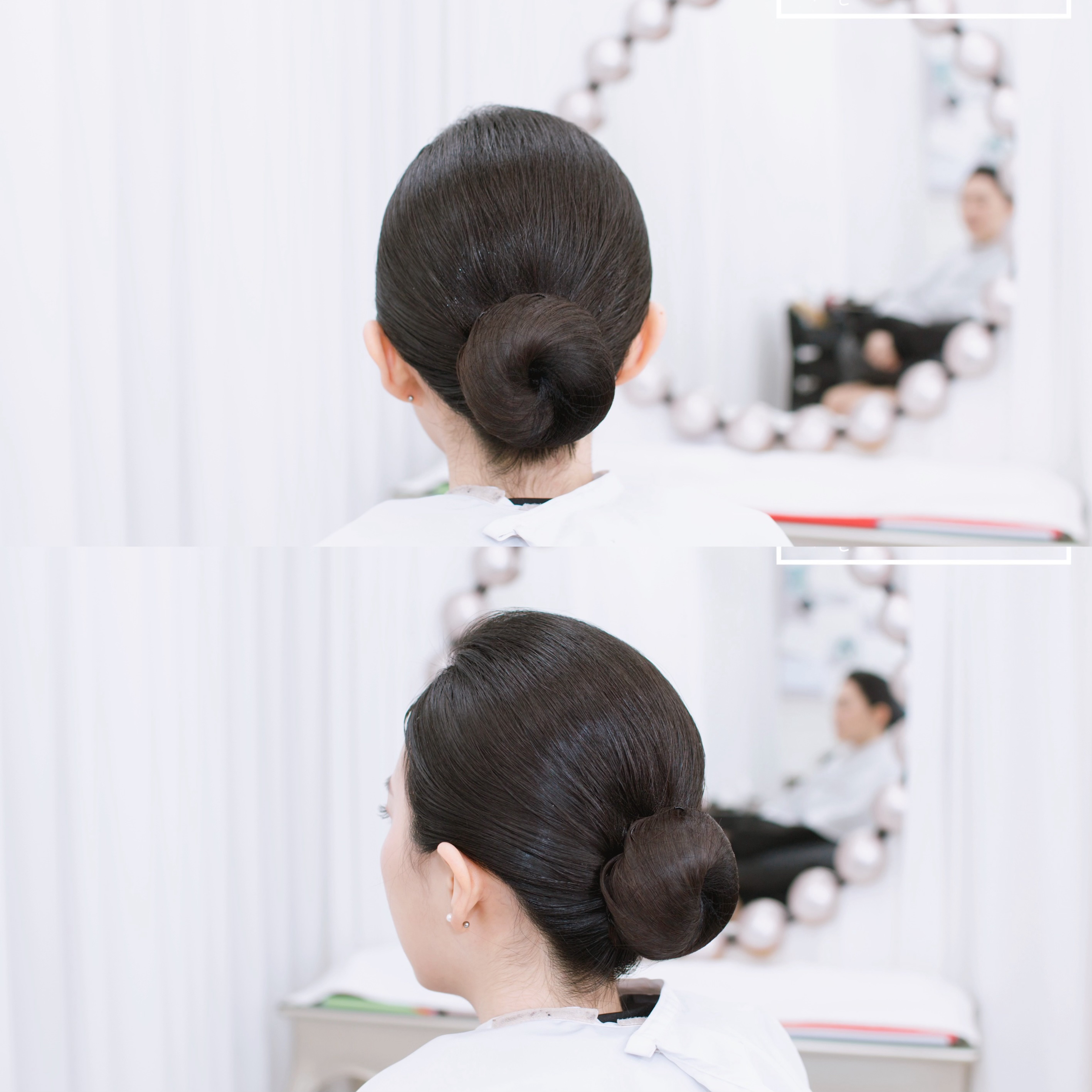 긴 머리는 깔끔하게 묶어 머리 망을 사용한