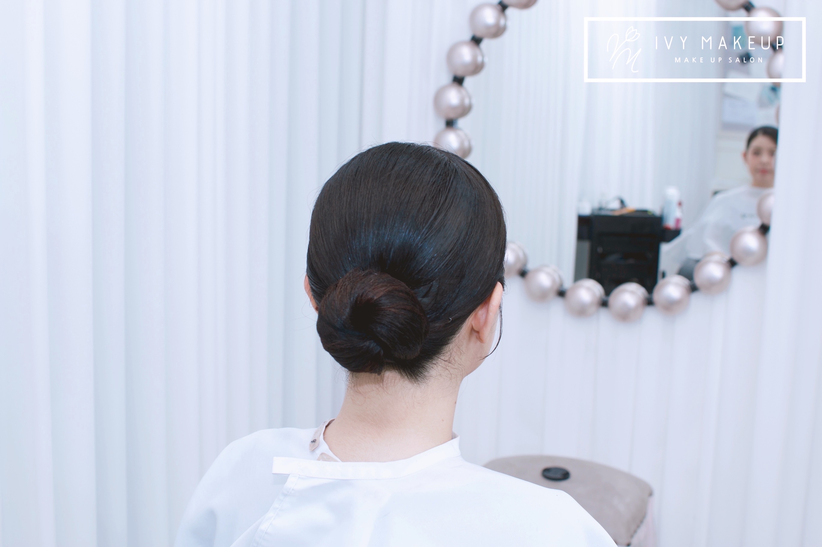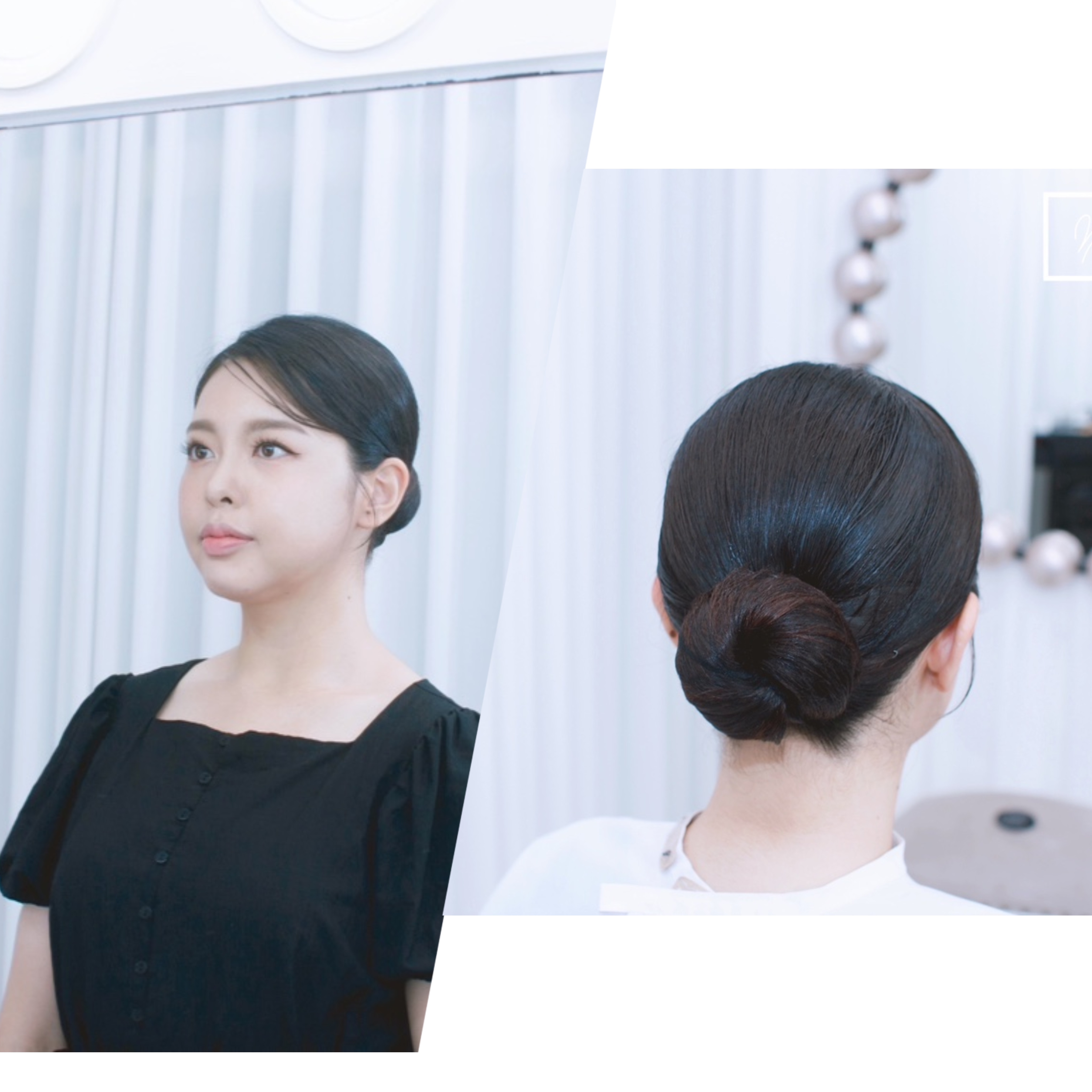 뒷머리는 깔끔하게 틀어 단아하면서도 우아한 이미지로 연출하여