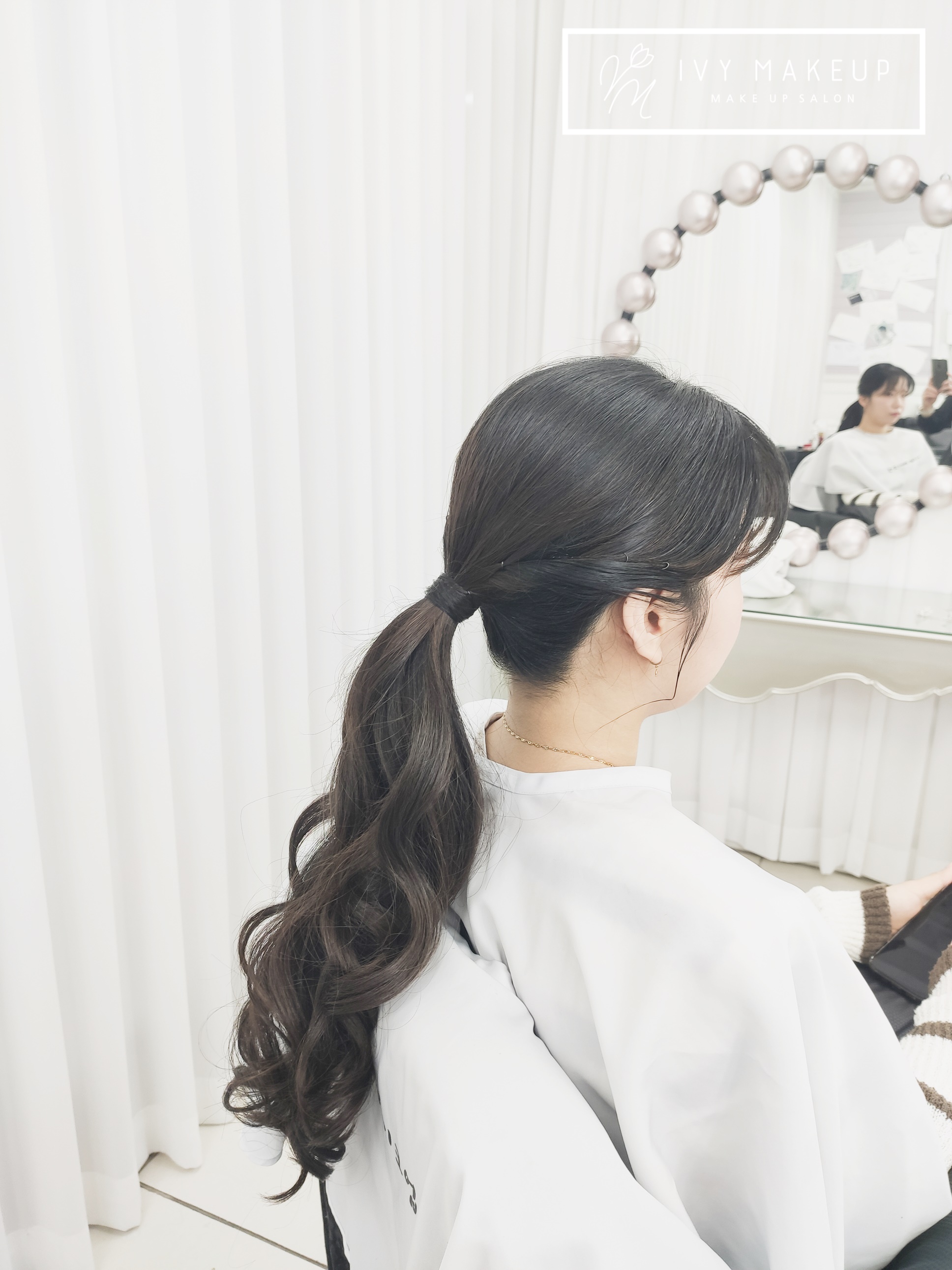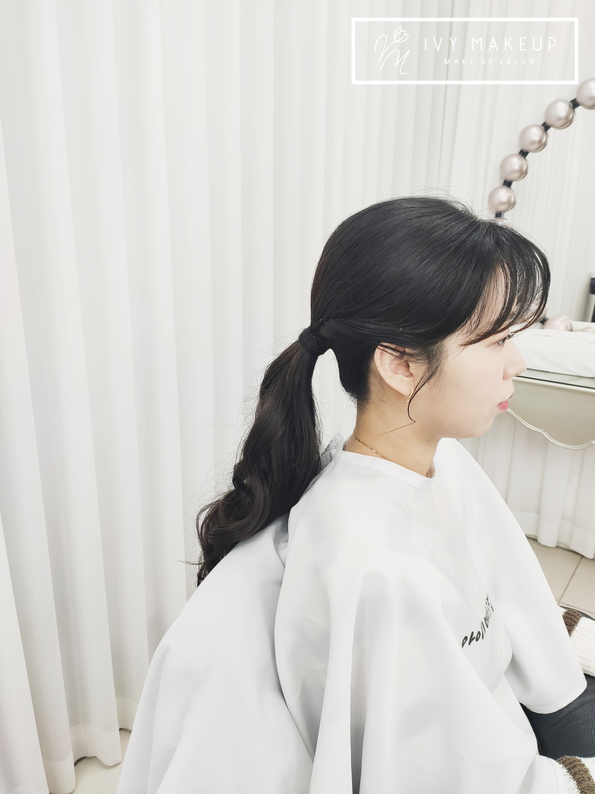 다운 포니테일로 스타일링으로 아이비 메이크업이
