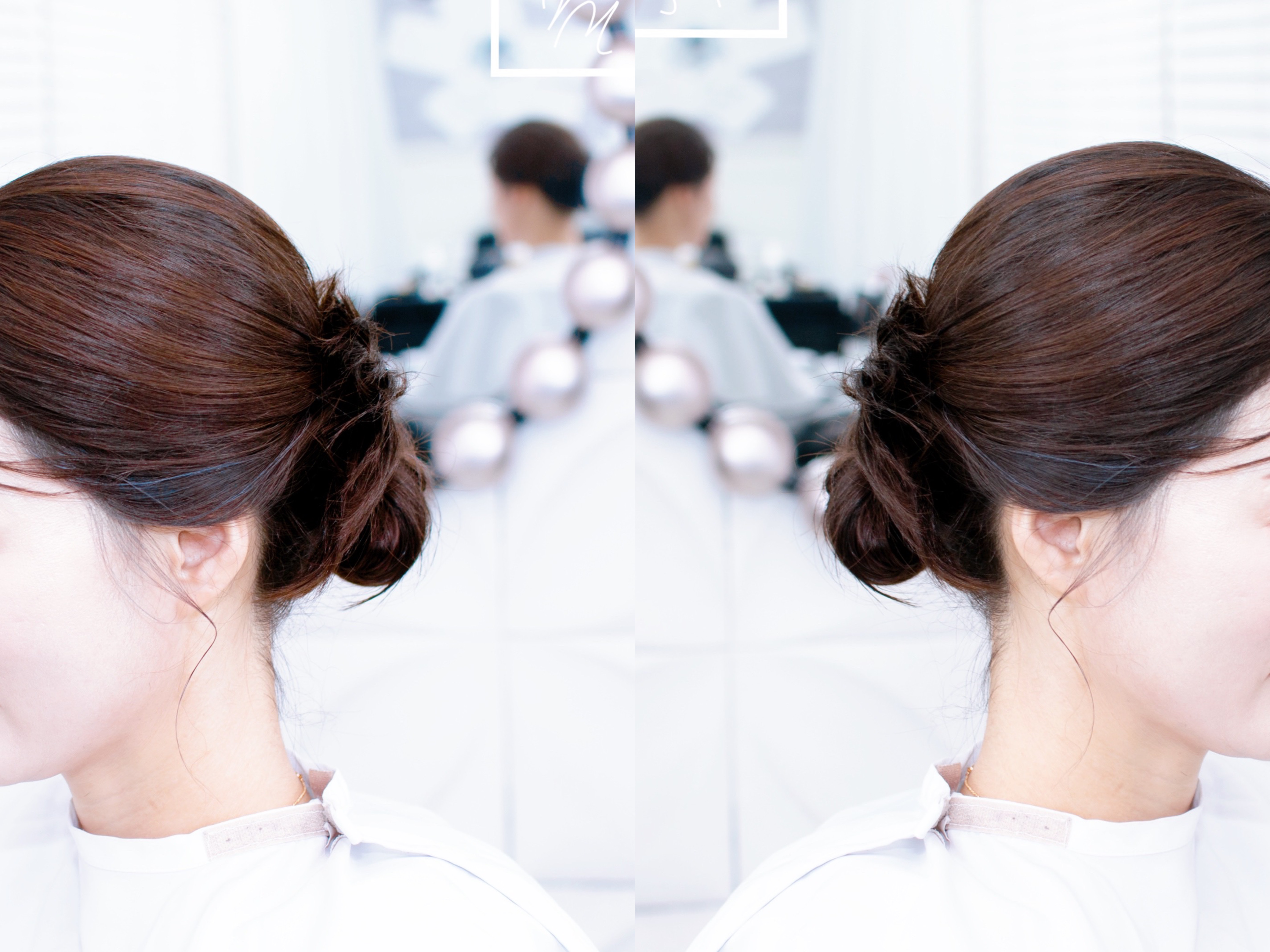 낮게 묶어 목선은 드러나도록 머리 끝부분은 자연스럽게 빼내