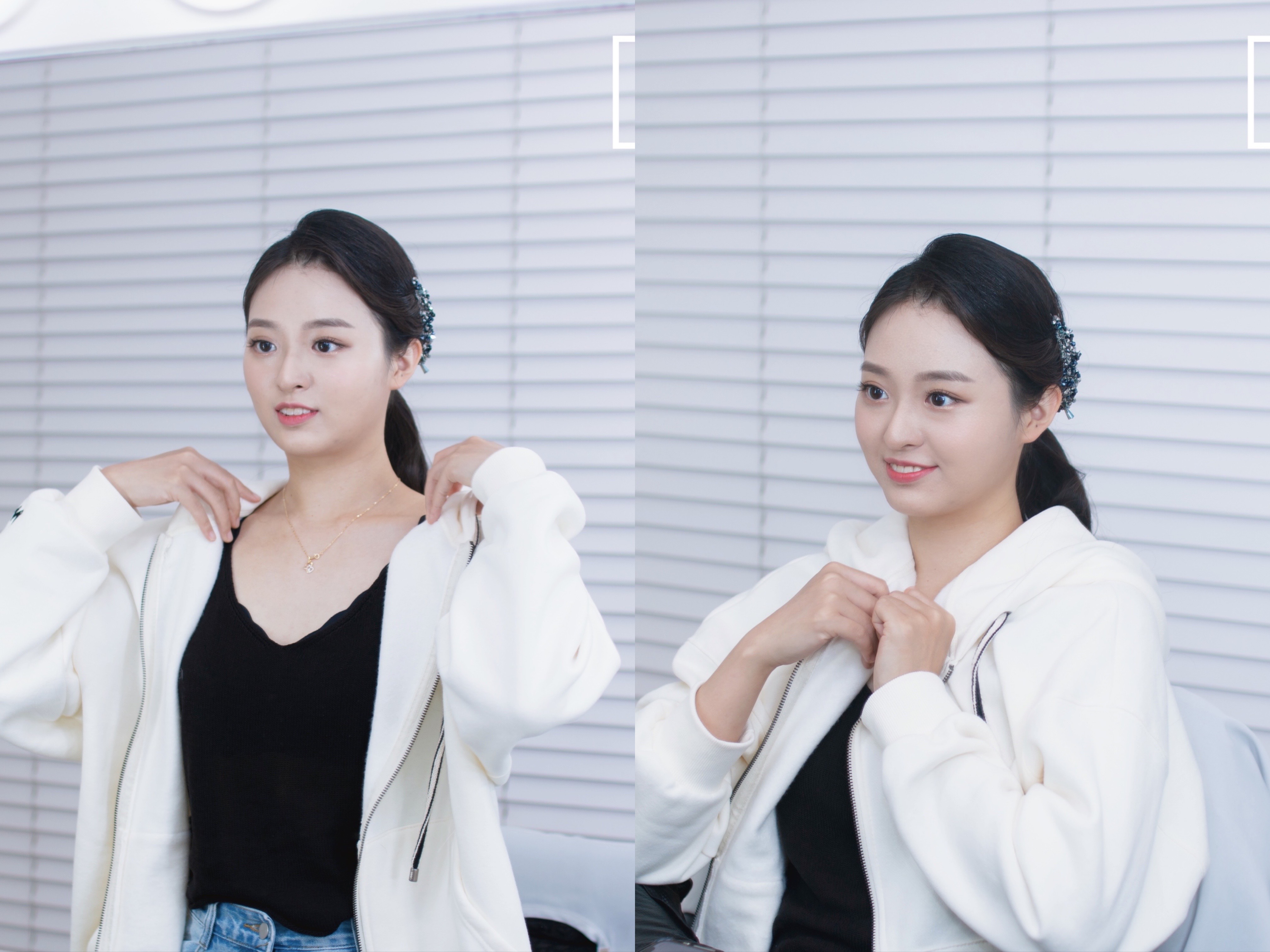 보이는 방향에 헤어 액세서리로 포인트를