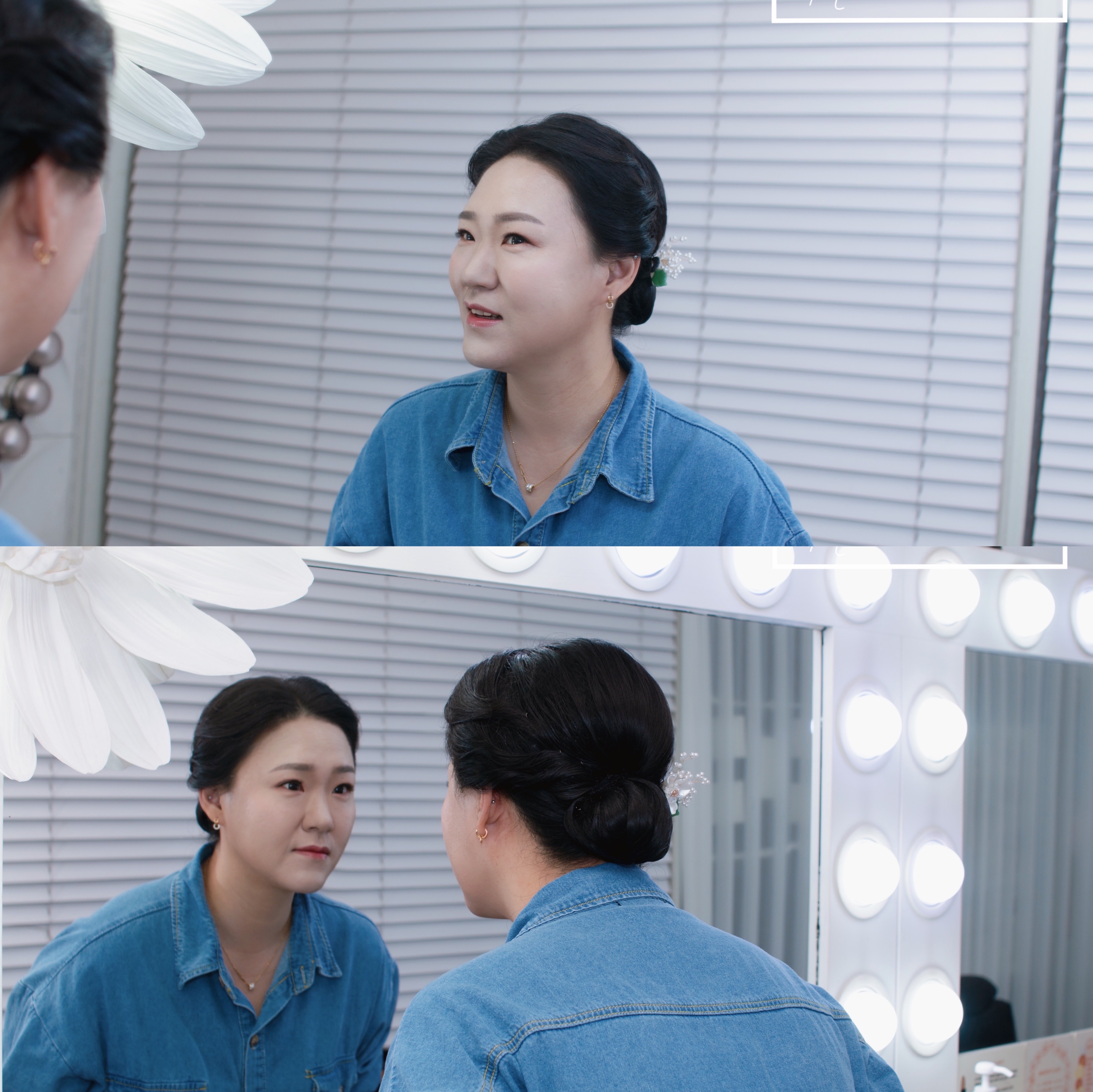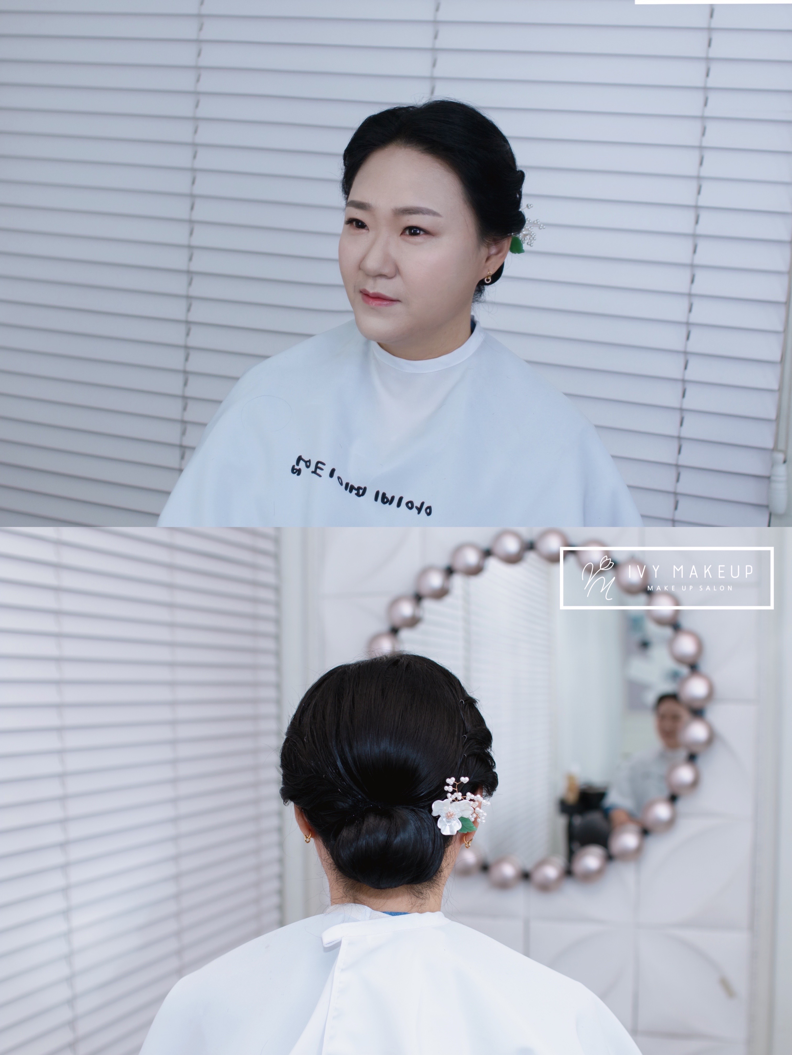 로우번 연출과 헤어 장식으로 마무리해 드렸어요.
